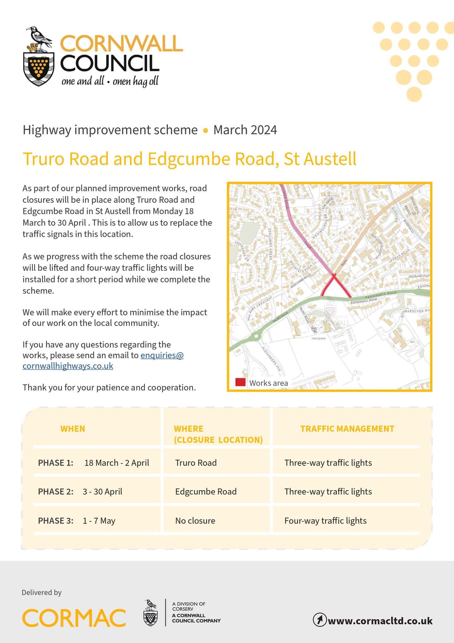 Cornwall Council has announced an extensive schedule of road improvements for Truro Road and Edgcumbe Road in St Austell, starting from Monday, 18 March to 30 April 2024.