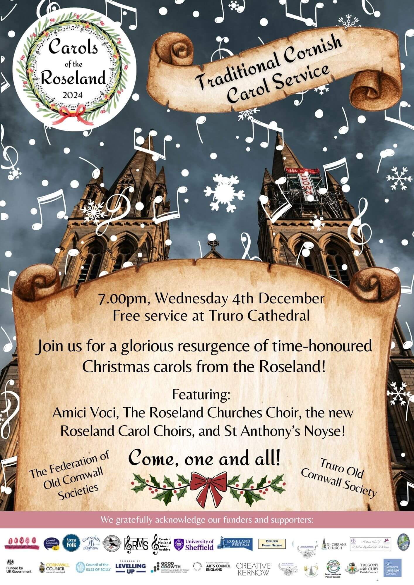 Truro Old Cornwall Society, in association with Truro Cathedral and the Federation of Old Cornwall Societies, welcomes you to the annual service of Cornish Carols. The service, led by Canon Alan Bashforth, will be live-streamed. Each year the service highlights local carols from a particular part of Cornwall. This year we feature the Carols of the Roseland.