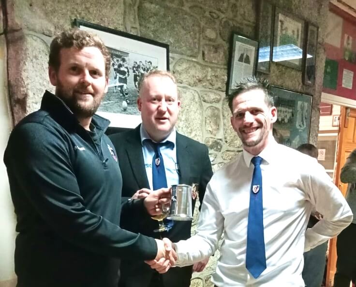 Photo: Pirates Amateurs’ head coach Murray Westren (left) presented a 300 games tankard to Rhodri (right). Also pictured centre is chairman Jack Nicholas.