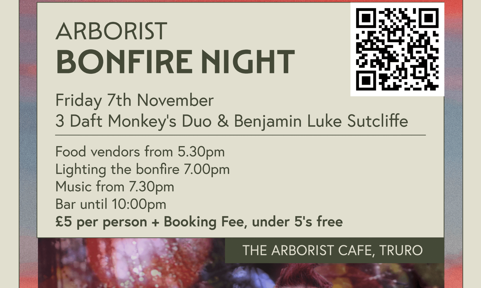 | We’re going to be lighting a rather jolly big bonfire, we will be illuminating the trees and we will be dancing to the sounds of 3 Daft Monkey’s Duo and Benjamin Luke Sutcliffe.