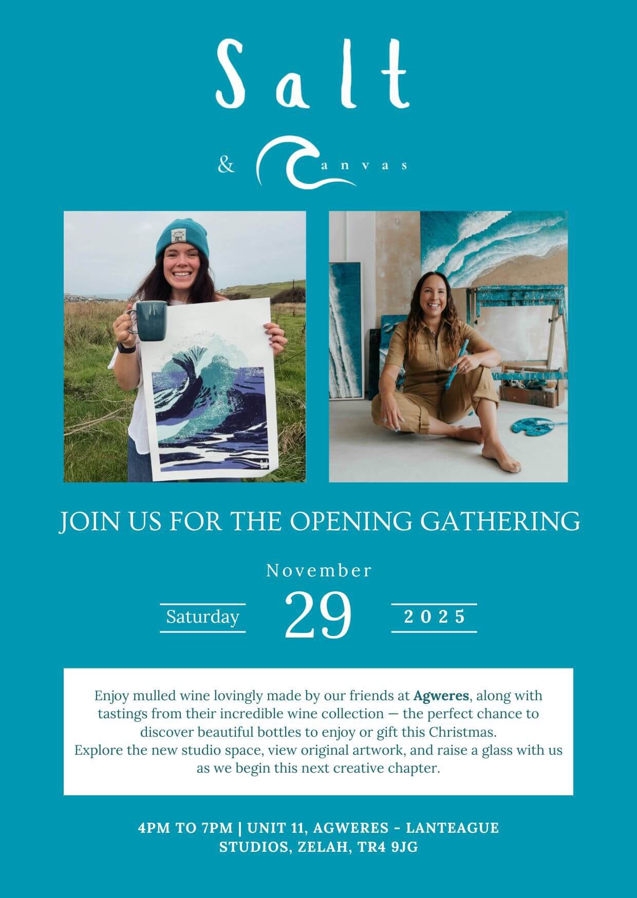 Salt & Canvas, founded by artists Gemma Lessinger and Bella Wilhm, will officially launch at Agweres, Unit 11, Lanteague Studios, on Saturday 29th November. The space will act as both a working studio and a gallery, where creativity, conversation and community come together.