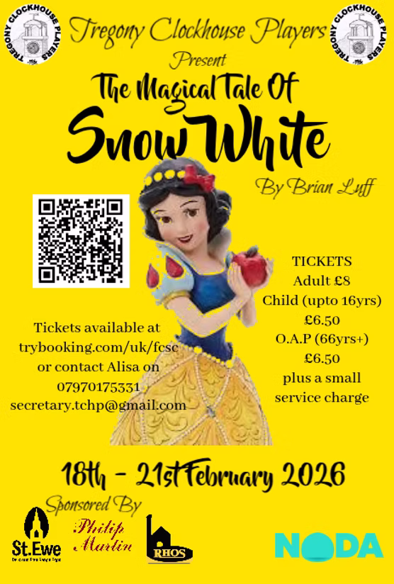 The Tregony Clockhouse Players will stage The Magical Tale of Snow White from 18th to 21st February 2026 at Tregony Village Hall, Back Lane, Tregony, Truro TR2 5RP, promising everything audiences expect from a traditional panto while also appealing for local support.