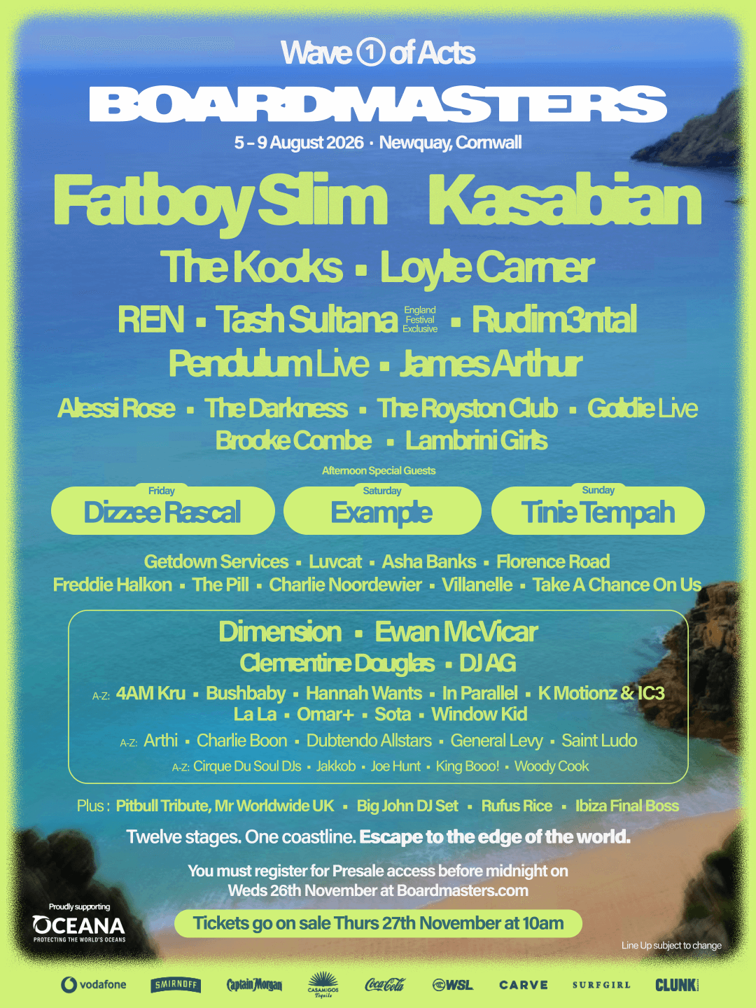 Key ticket and line up dates for Boardmasters 2026 are: