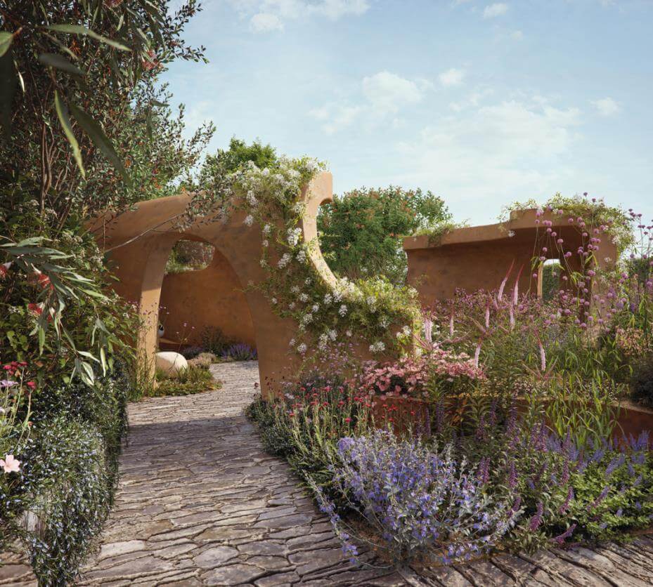Visitors will encounter four 2.5-metre-high clay structures, forming a cocoon-like space that evokes the protective nature of the womb. Within, richly planted borders will move from soft pastel tones to bolder shades, cascading around five sculptures created by ceramicist Hannah Hartwell, each representing one of the five cancers.