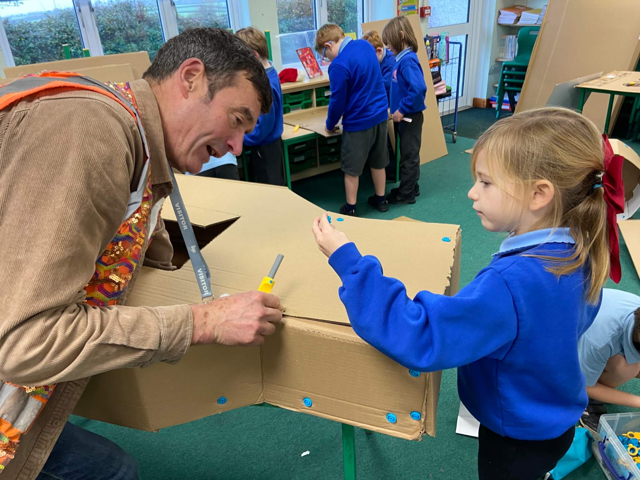 Children in years 2 and 3 worked with artist Nick Corston from charity STEAM Co. to design and build the car. Using donated cardboard from a local builders’ merchant, the pupils learned how to measure, cut and construct the full-scale model as a team.