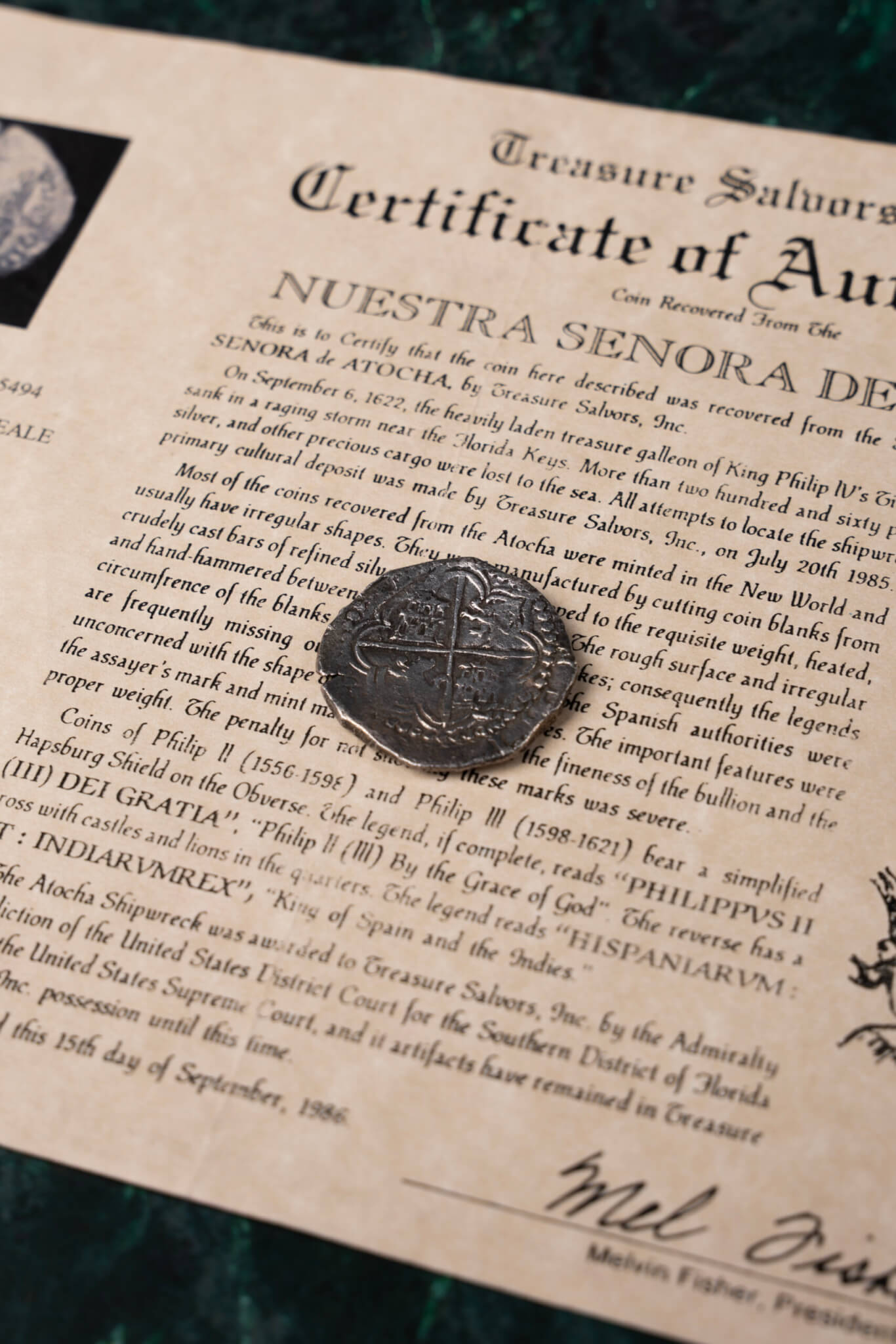 Among the shipwreck pieces up for sale is a Charles II silver Cob of 8 Reales from Bolivia, dated 1686 and weighing 25.41g. The coin shows saltwater corrosion and a flan crack. It sank with HMS Association in 1707 and comes with a Certificate of Authenticity. It is estimated at £300 to £400.