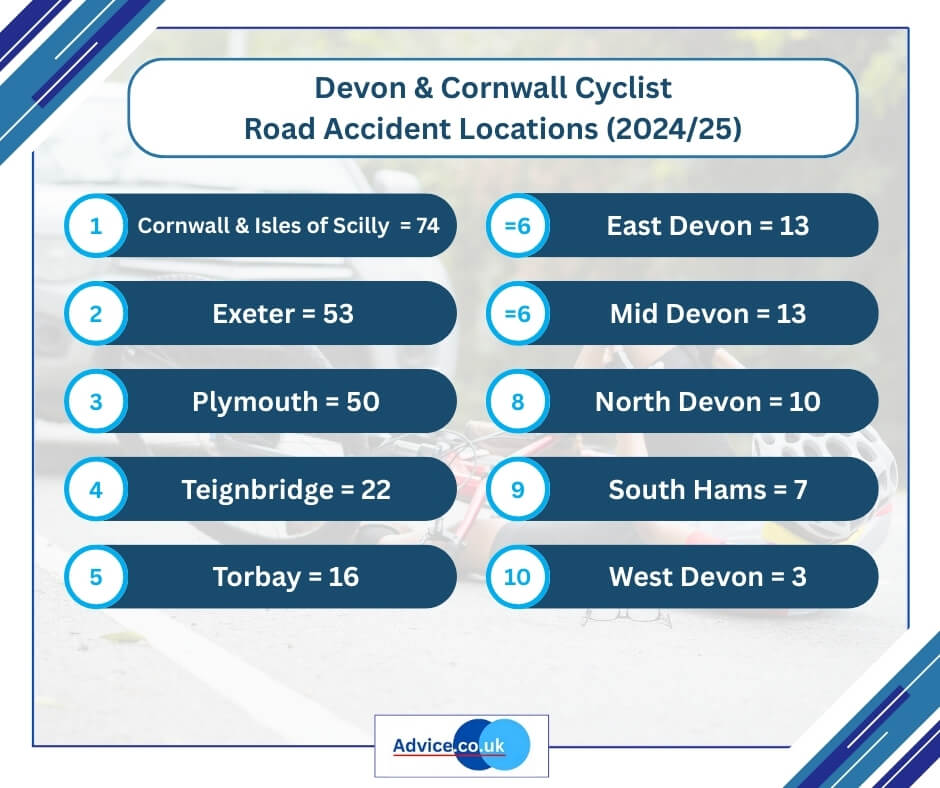 The highest number of accidents occurred in Cornwall and the Isles of Scilly, with 74 recorded incidents. This was followed by Exeter, where 53 cyclist accidents took place.