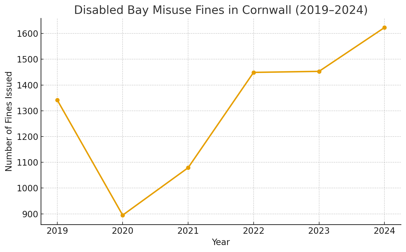 According to data obtained via a Freedom of Information (FOI) request by Evans Halshaw, a total of 7,841 fines were handed out across Cornwall between 2019 and 2024 for parking in disabled bays without displaying a valid Blue Badge.