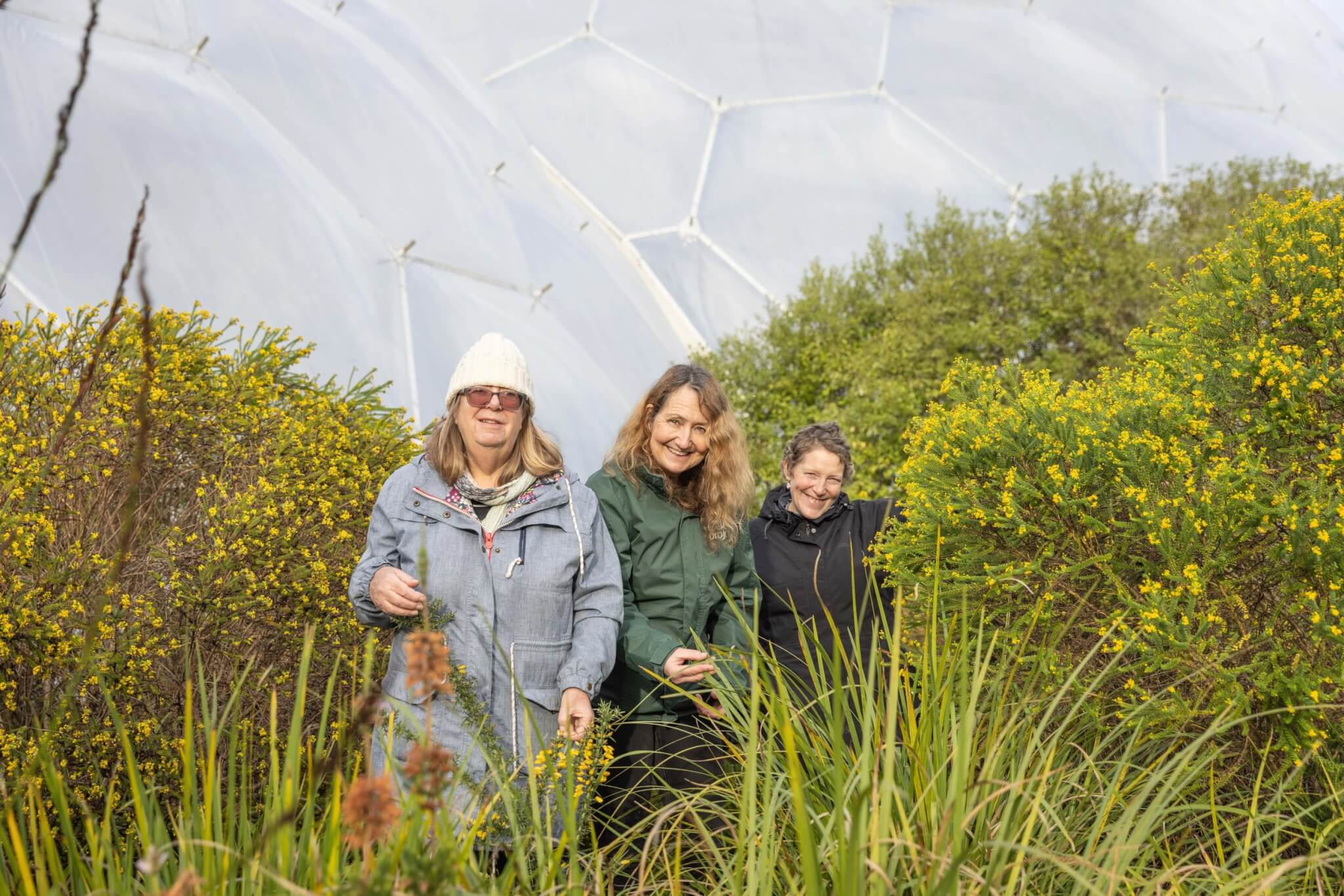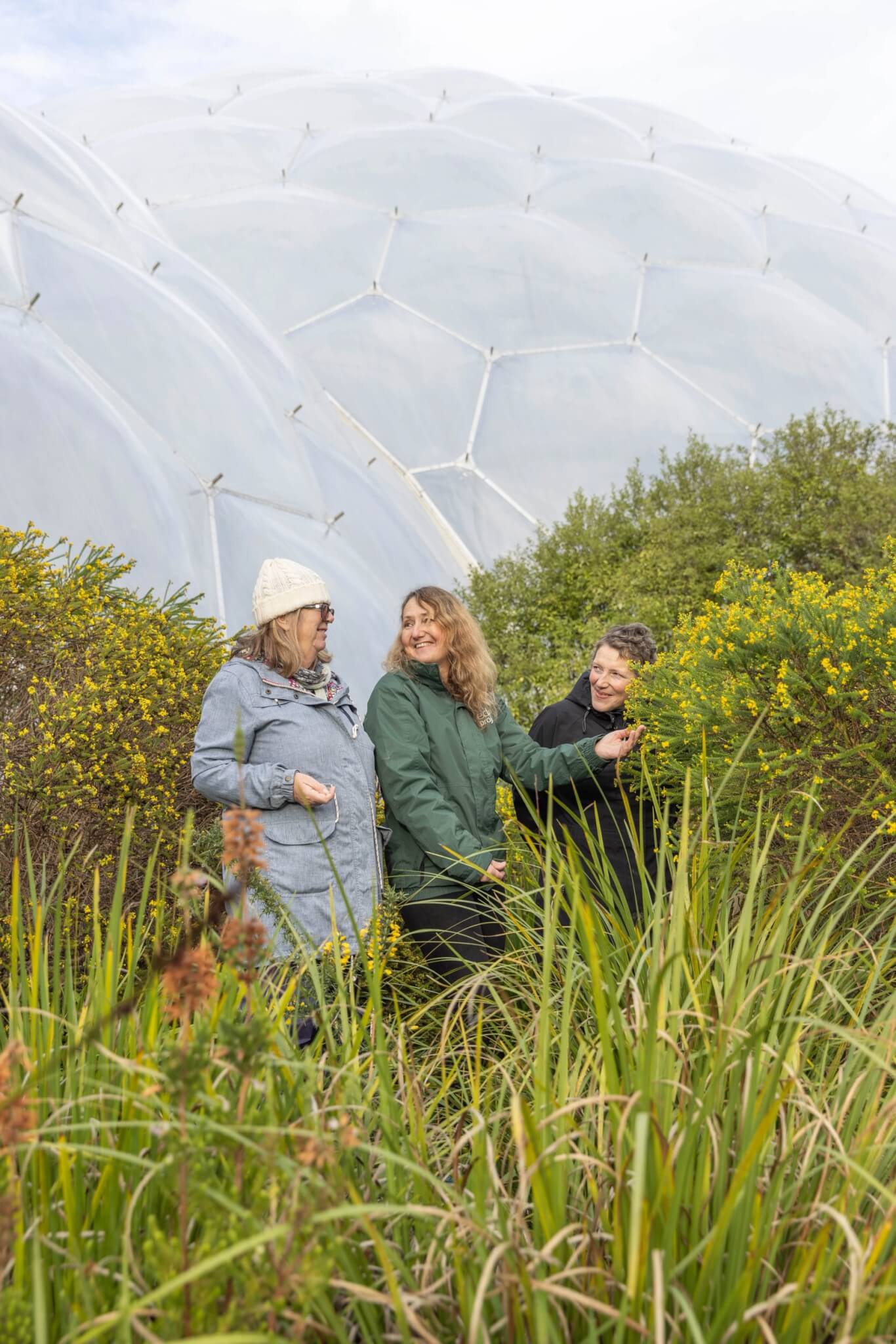 📷From left MAZ LYNES (Nature Connections participant), SAM ALFORD (Head of Nature Connections, Eden Project), EMMA CARTER (Nature Connections participant), in front of the Eden Project Biomes