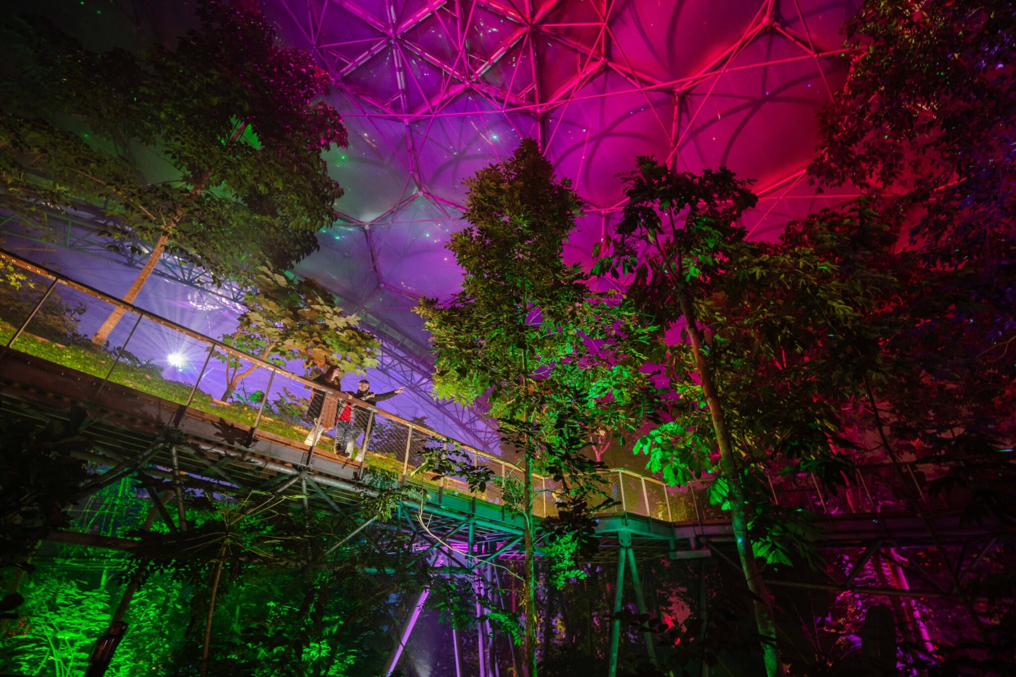 In the Rainforest Biome, lights are intricately woven with the natural surroundings, creating an immersive experience enhanced by a carefully designed soundscape. This area invites visitors to connect with the beauty of nature, showcased in a festive, reflective light show.