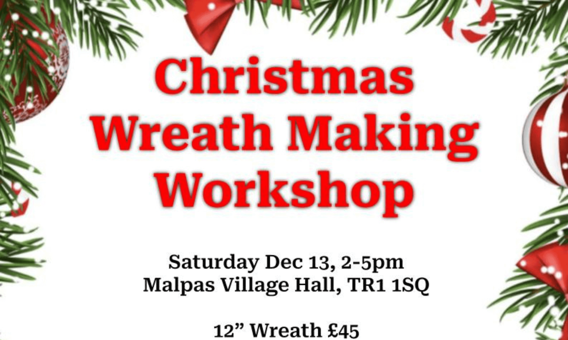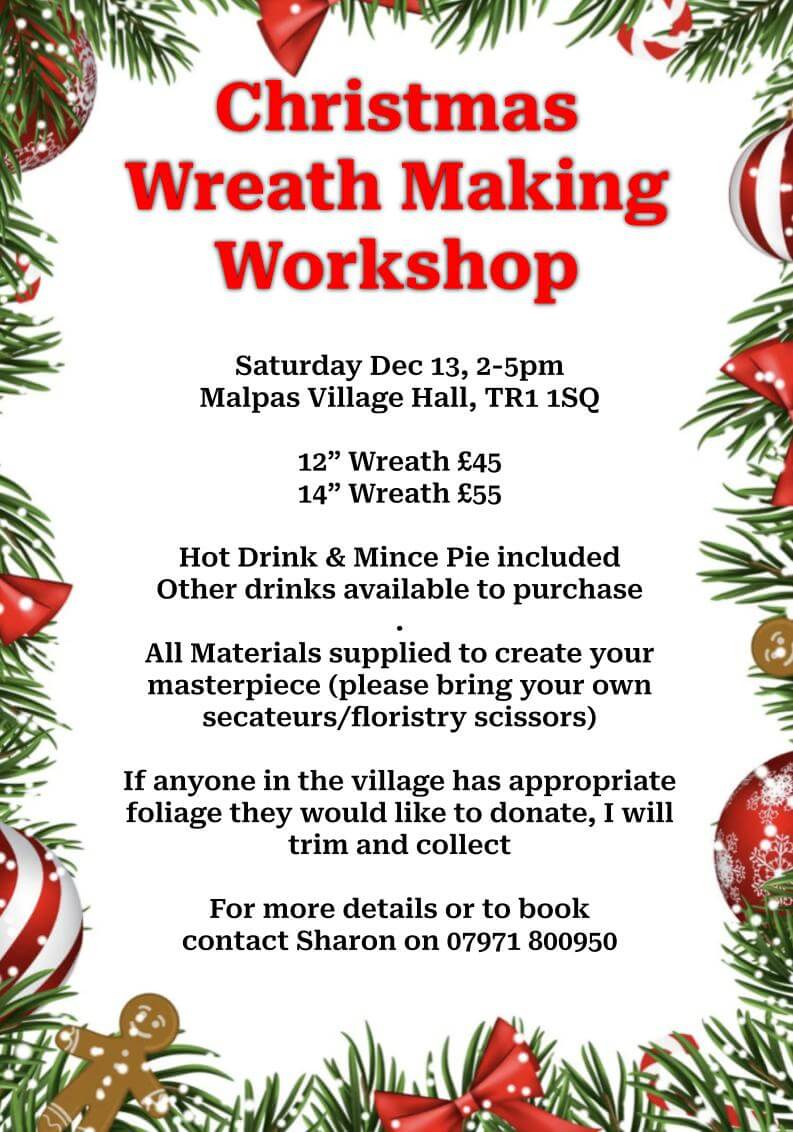 A Christmas Wreath Making Workshop is set to take place at Malpas Village Hall (TR1 1SQ) on Saturday 13th December, running from 2pm to 5pm.