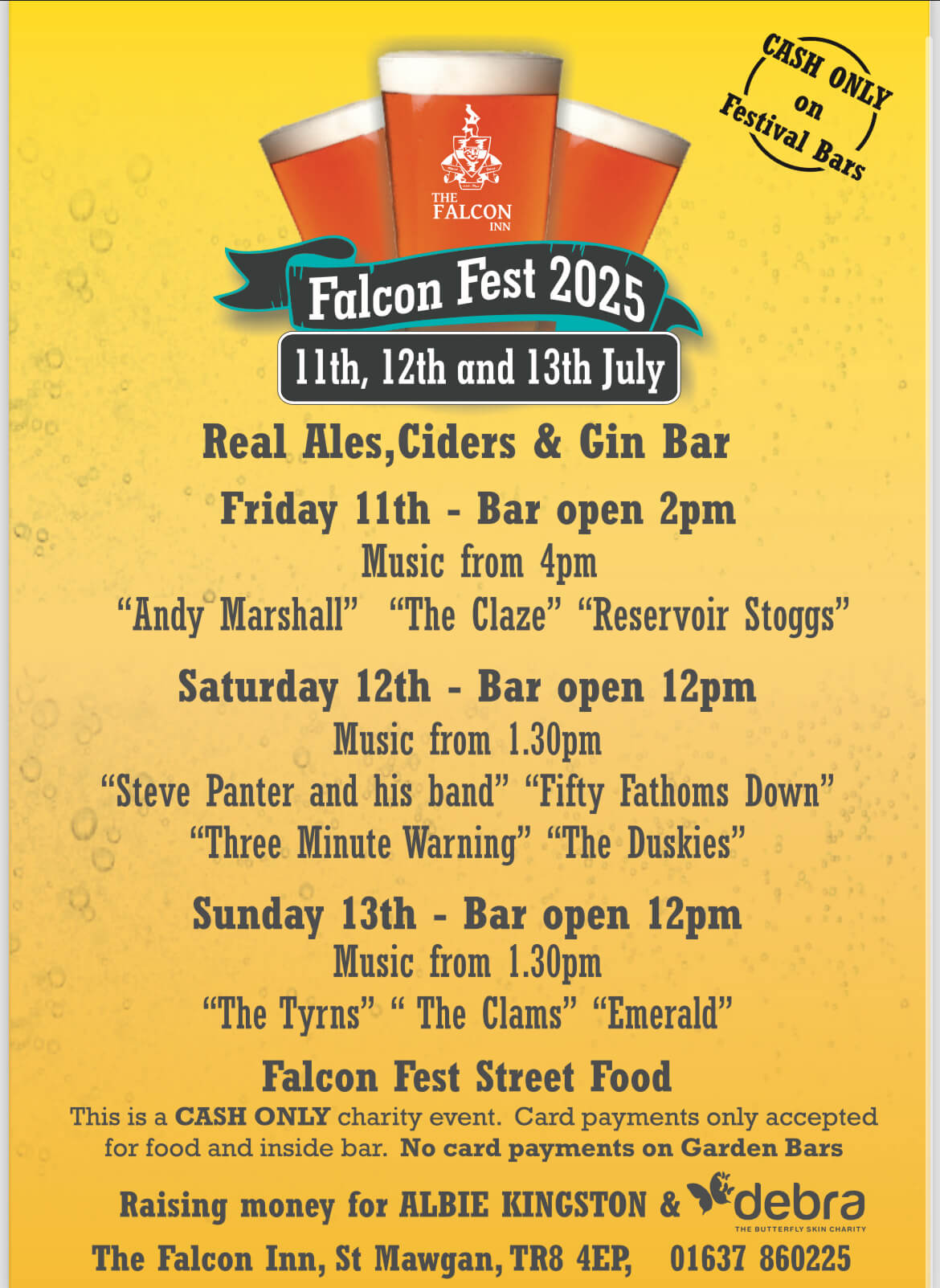 Three day, Ale, Cider and Music Festival held in the beautiful Falcon Inn Beer Garden. 10 real ales, 10 ciders, Gin Bar and fantastic live bands. Raising money for DEBRA the Butterfly Skin Charity.
