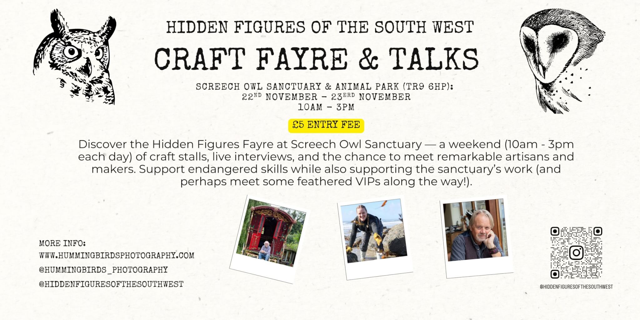 Explore beautiful craft stalls and enjoy live interviews with Stratum Marquetry, Bristol Broomworks, members of the Screech team, and Caitlin Pharoah, the talented photographer behind it all, along with many other incredible Hidden Figures. Your visit helps keep endangered skills alive while supporting the vital work we do caring for our rescued owls and wildlife. And of course, you might even meet a few of our feathered VIPs along the way! |