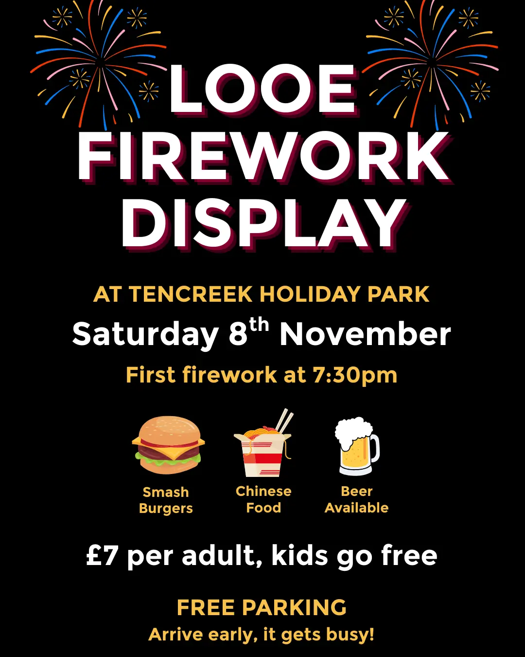 The fireworks begin at 7.30pm (gates open 4pm so please arrive early) and entry is £7 for adults, with kids and under 16s free. Pay on the gate.