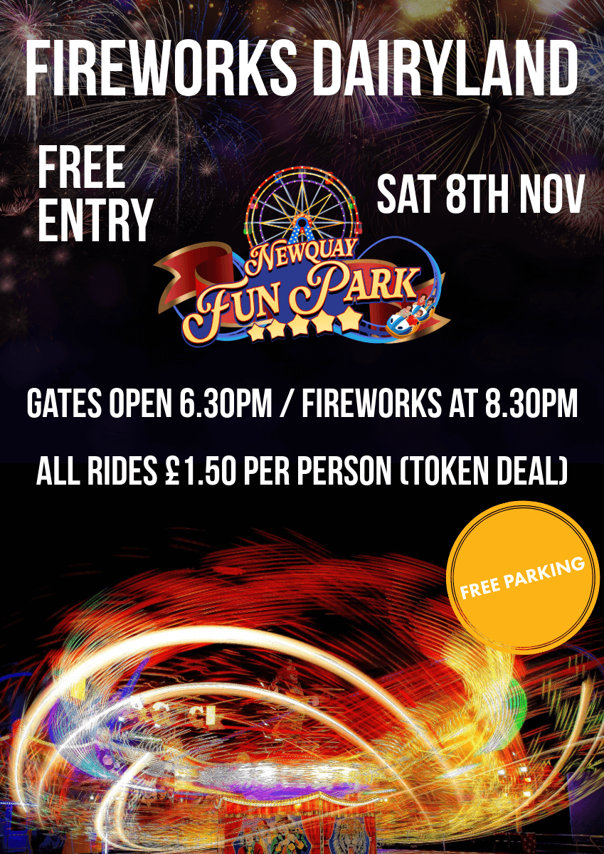 Open from 6.30pm, with fireworks at 8.30pm. This Saturday 8th November, join us for a night of exciting rides, walk through our scare maze, toast marshmallows or enjoy a hot chocolate whilst watching our free firework display!