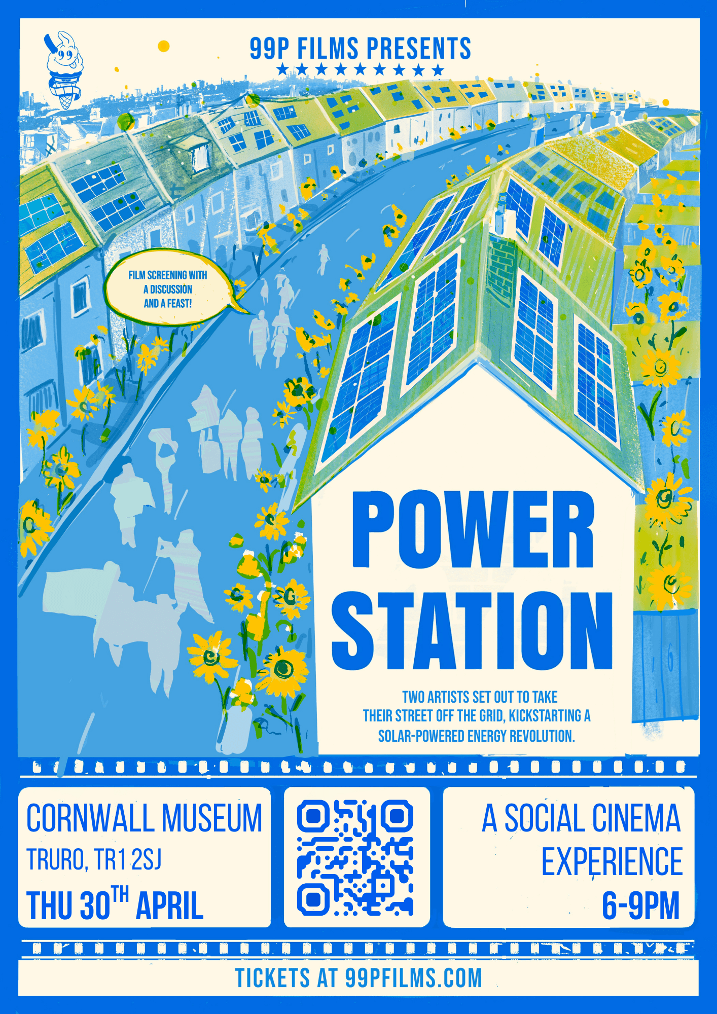 Can a whole street be powered by the sun? The idea began in the depths of lockdown with the question ‘what could we do from where we live, with the people around us, to build power – of energy and imagination?’ Working to turn a street and local schools solar, Power Station is a scalable, in-your-face prototype of community led power. Channelling Withnail and I and Ealing comedies, the film charts the financial and emotional trials and tribulations of making change together. From sleeping on rooftops to growing thousands of sunflowers and attempts at Christmas number one, community spirit and resilience are at the heart of this documentary. Programme for the evening: 5:45pm – Doors open Feast: All the food for this event is sourced through the Falmouth Food Co-op, winner of the Sustainable Food or Drink category at this year’s Cornwall Sustainability Awards. Their produce supports local Cornish market gardens, including Loveland, British grains producer Hodmedods and a host of other organic and regenerative growers. We will be working with our trusted Syrian Chef Iman, building off her signature dishes and introducing you all to some new culinary wonders. We use as much seasonal produce as possible, so will provide a confirmed menu closer to the time which will be emailed to all ticket holders. The meal will be vegan and gluten free. Please note that food is prepared in a kitchen that handles a range of ingredients, including gluten, so may contain traces of allergens. |
