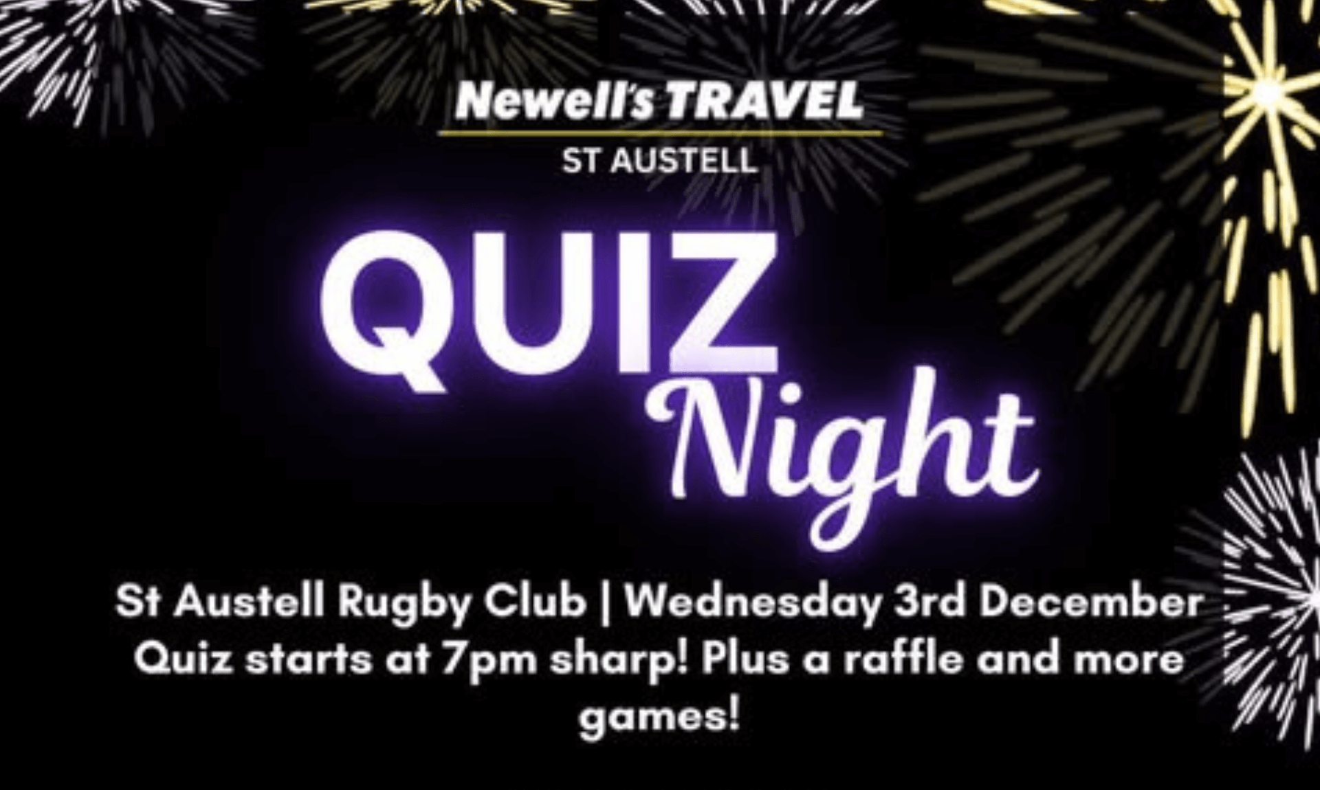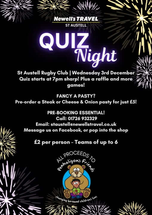 Newell’s Travel, one of the CRFU’s returning sponsors this season, is holding a charity Quiz Night on Wednesday 3rd December at St Austell Rugby Club. The event supports Penhaligon’s Friends, a Cornish charity that helps bereaved children and their families.