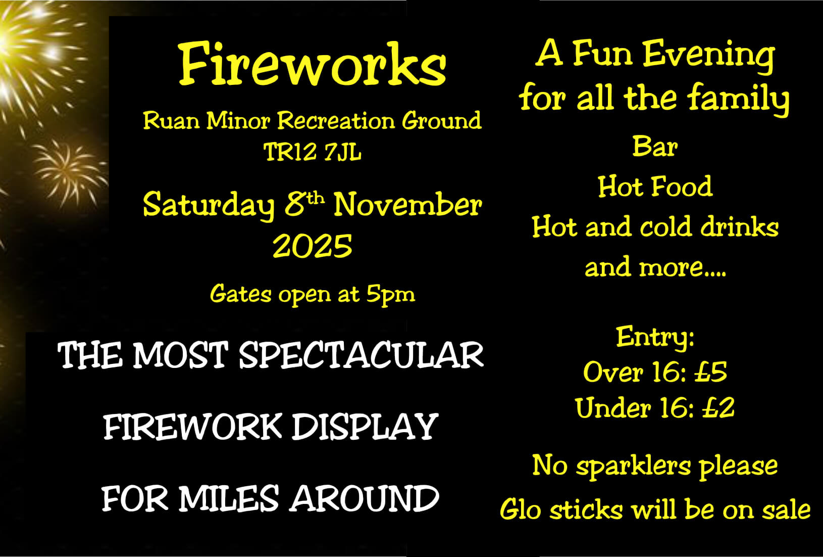 Please note: Sparklers are not allowed, but glow sticks will be available to buy.
