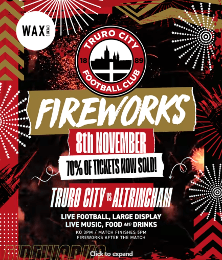 Truro City is delighted to announce, in partnership with WAX Events, an incredible afternoon and evening of football, food, drink and fireworks on Saturday, November 8.