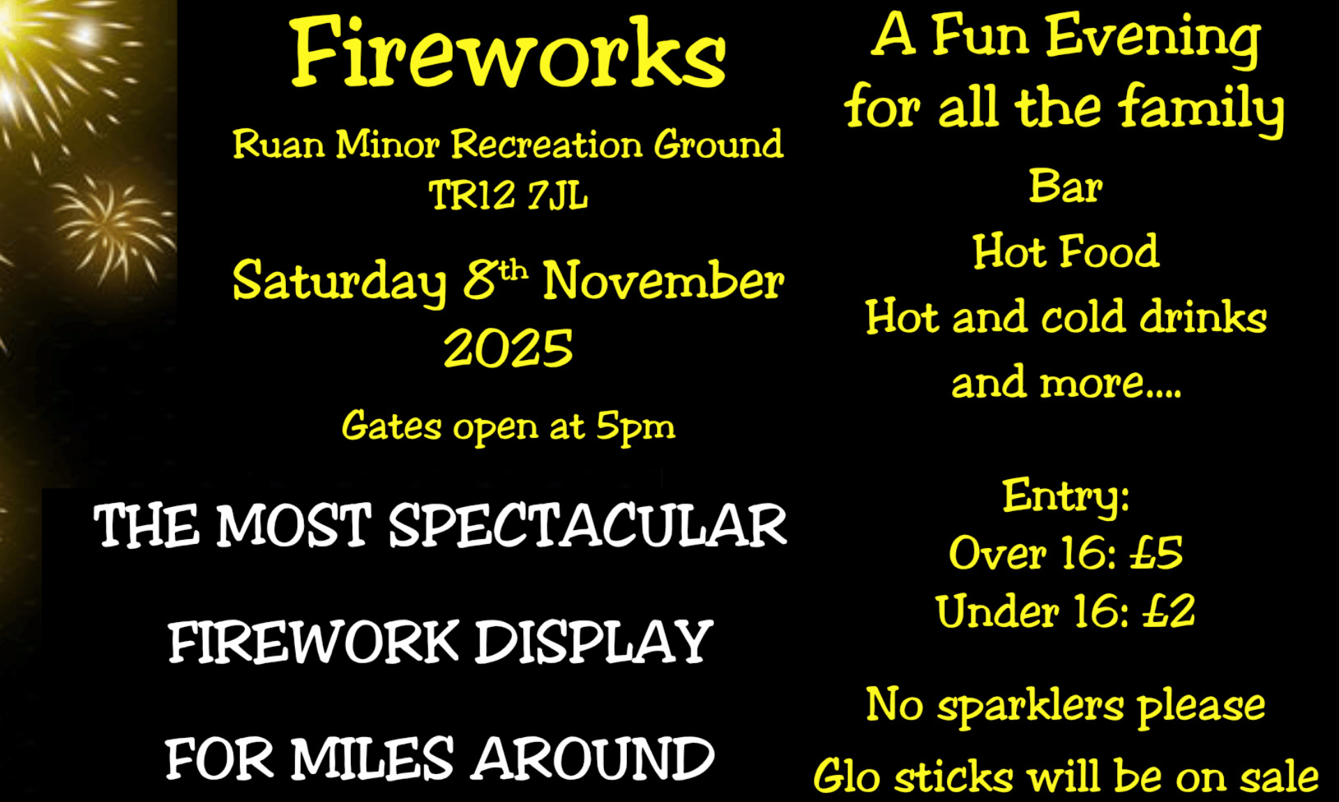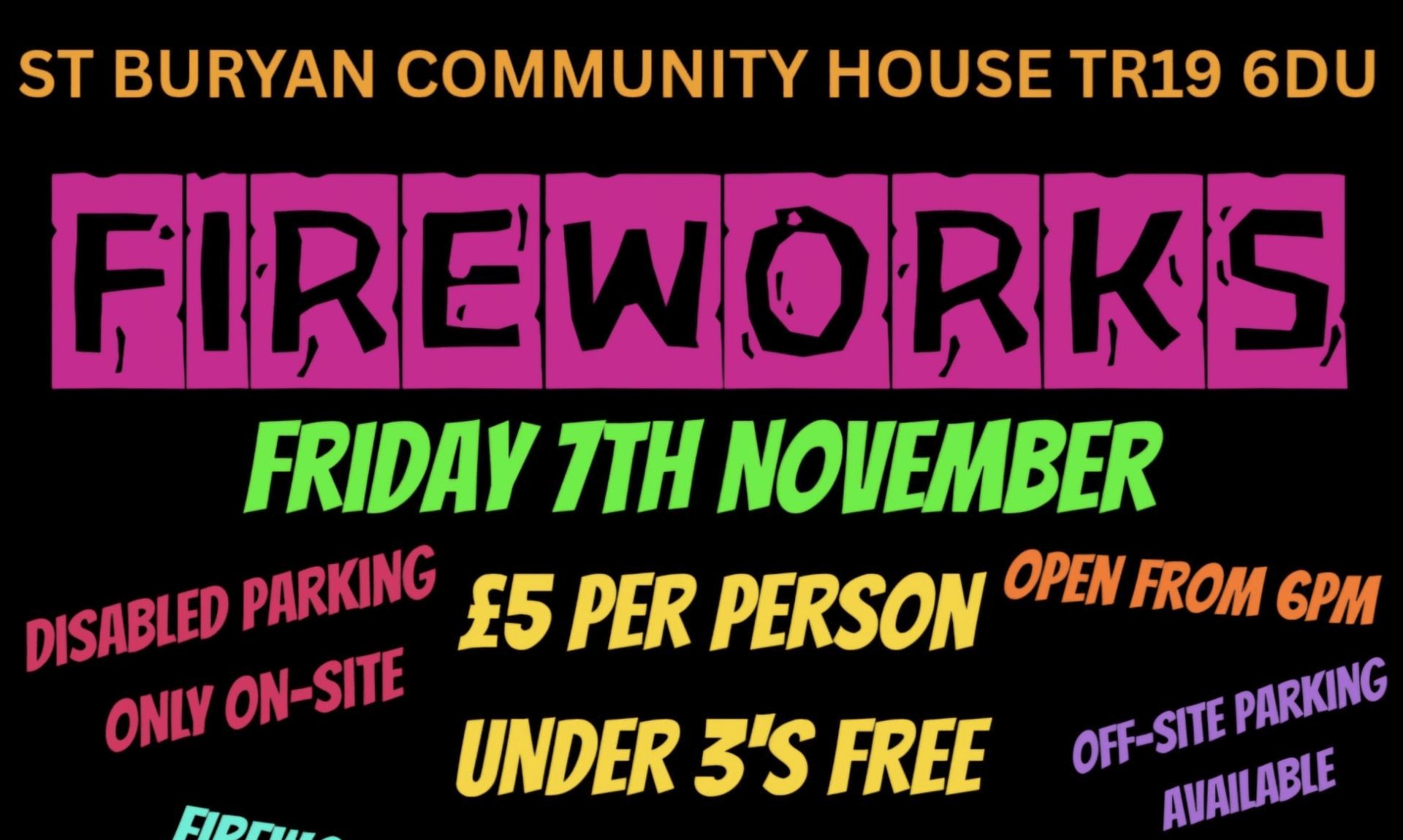 Gates open at 6pm, fireworks from 7pm. Entry £3 per person (under-threes go free). Food by the Friends of St Buryan School and disabled parking available. No sparklers permitted.