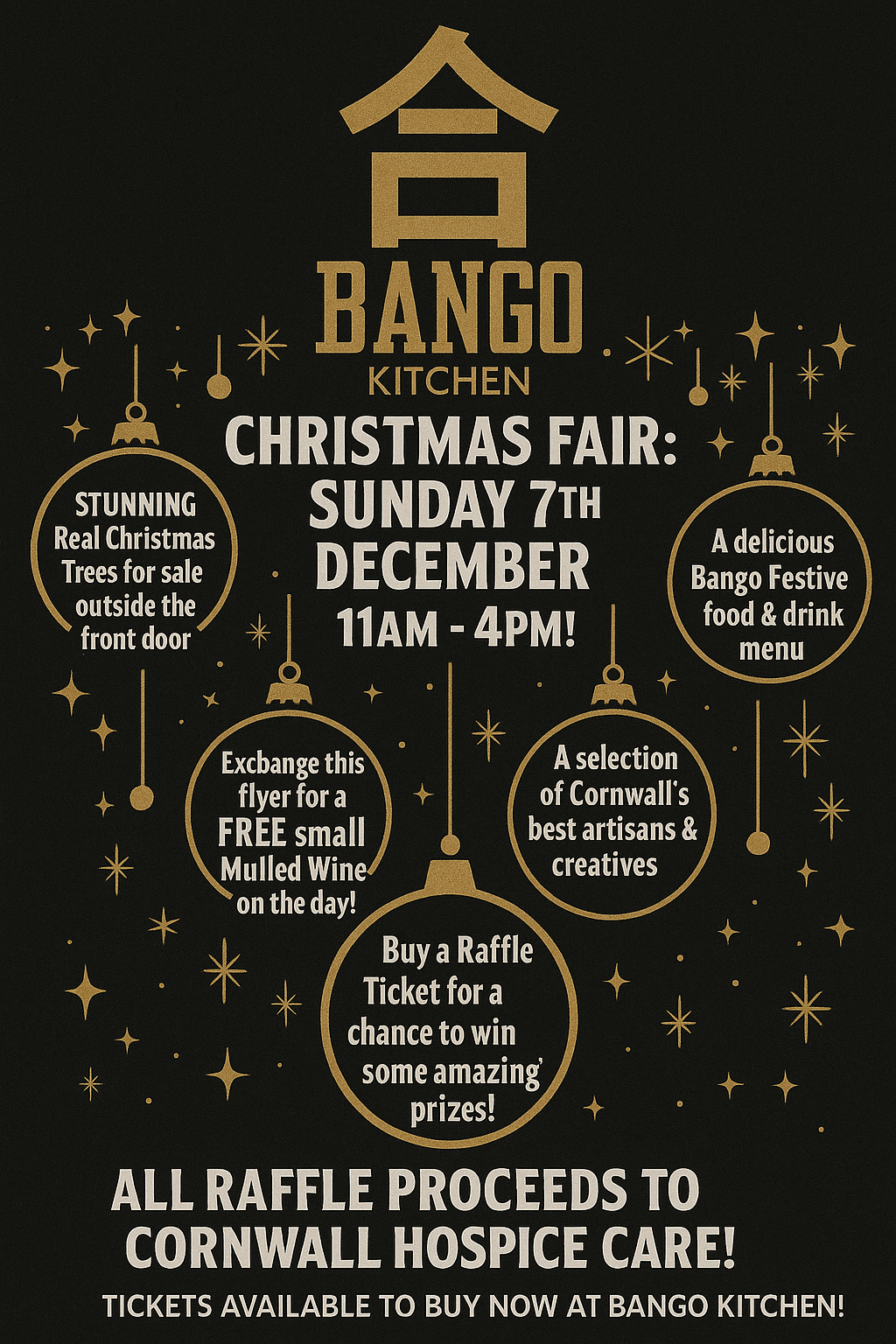 Visitors can browse a wide mix of handmade gifts, crafts and locally produced items from a range of Cornish traders. Alongside the stalls, Bango Kitchen will be serving a one-day-only festive menu, with mulled wine and cider available throughout the event.