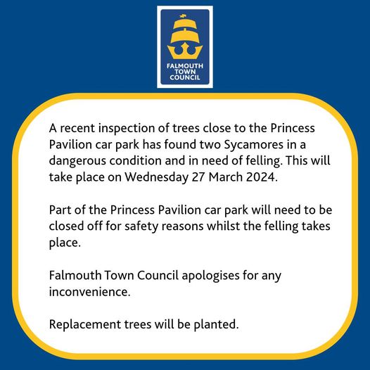 Falmouth Town Council has announced a partial closure of the Princess Pavilion car park for most of today, in a bid to ensure public safety by removing two hazardous Sycamore trees in the vicinity. The action comes after a safety assessment deemed the trees a potential risk to visitors and vehicles.