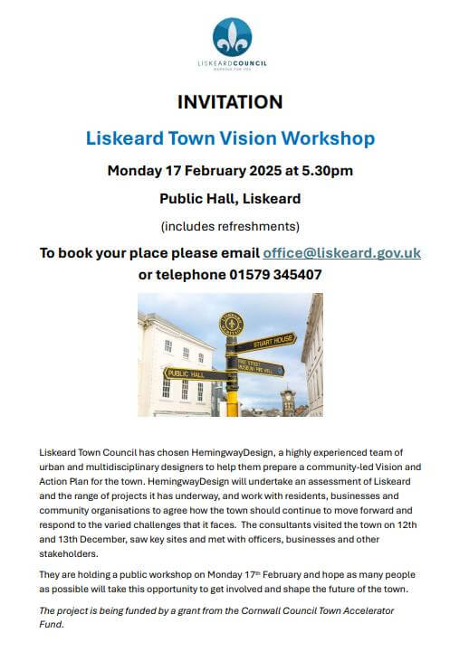 To secure a spot, email office@liskeard.gov.uk or call 01579 345407 on weekdays between 9am – 1pm. Attendees should also mention any dietary requirements when booking.