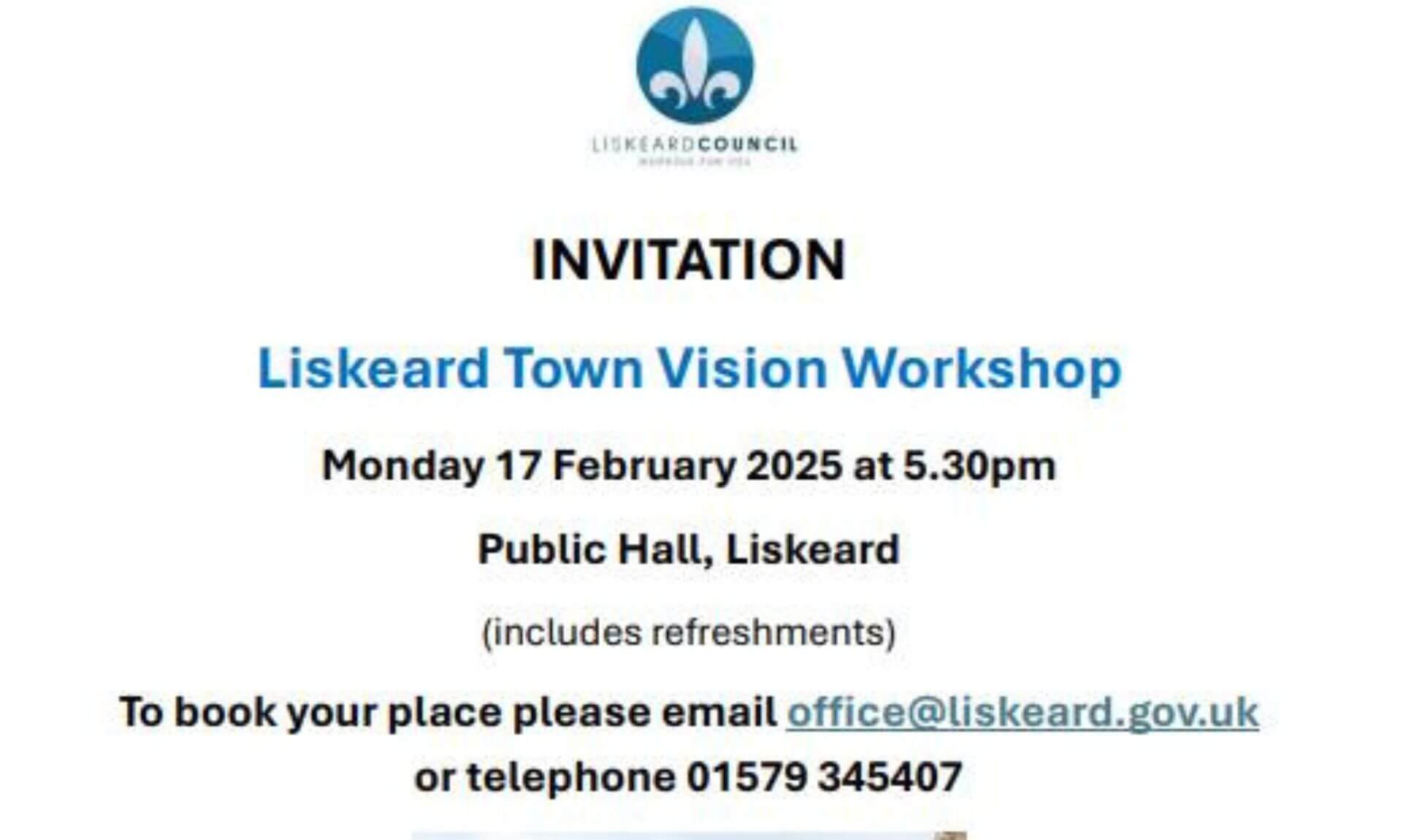 Liskeard residents, business owners, and community representatives are invited to take part in a Town Vision Workshop to help shape the future of the town. The event will take place on Monday 17th February 2025 at 5.30pm at the Public Hall, Liskeard, with spaces filling up fast.