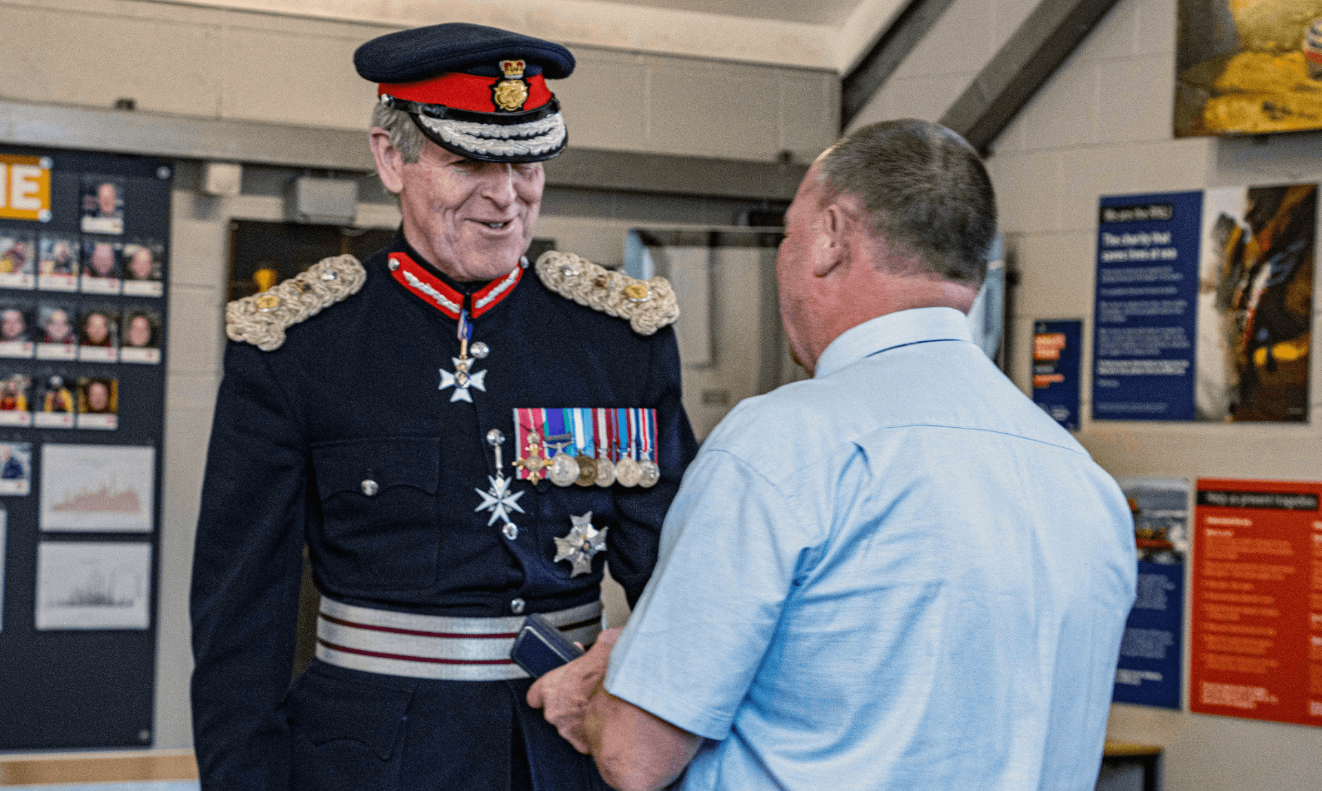 During a visit to RNLI Looe Lifeboat Station on Sunday 6th April 2025, Colonel Sir Edward Bolitho, the Lord Lieutenant of Cornwall, presented 20-year long service medals to Clive Palfrey and Del Palfrey.