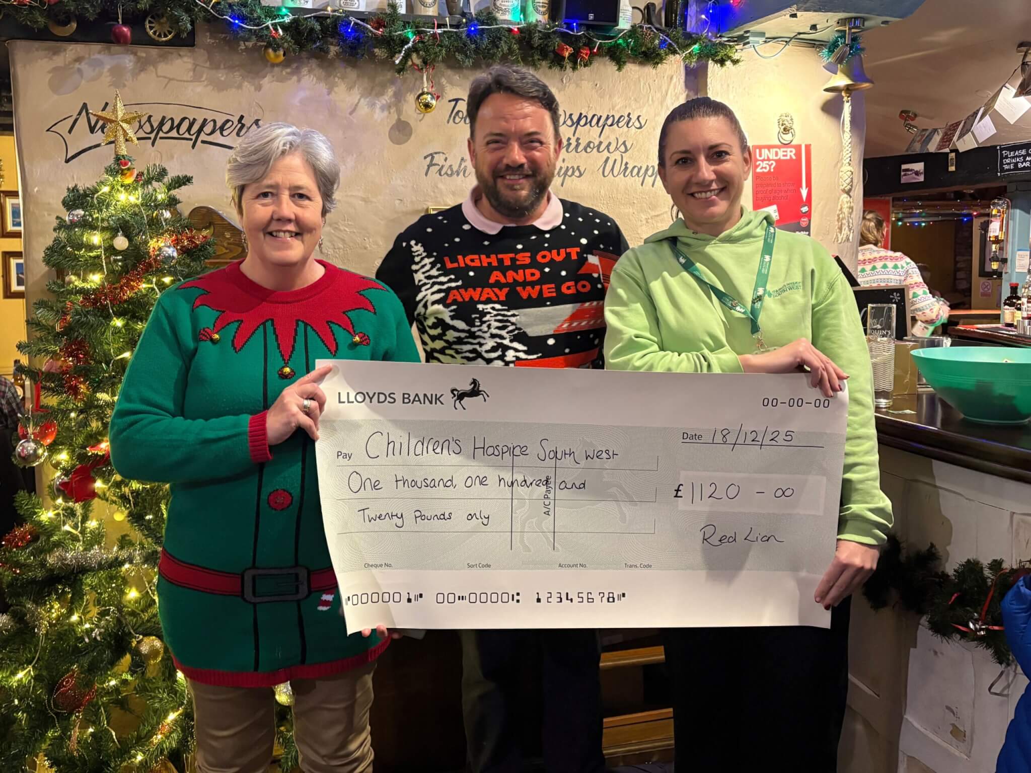 The Red Lion in Mawnan Smith marked the end of a successful year of monthly pub quizzes by presenting a cheque for £1,120 to Children’s Hospice South West at a special Christmas quiz event in December 2025.