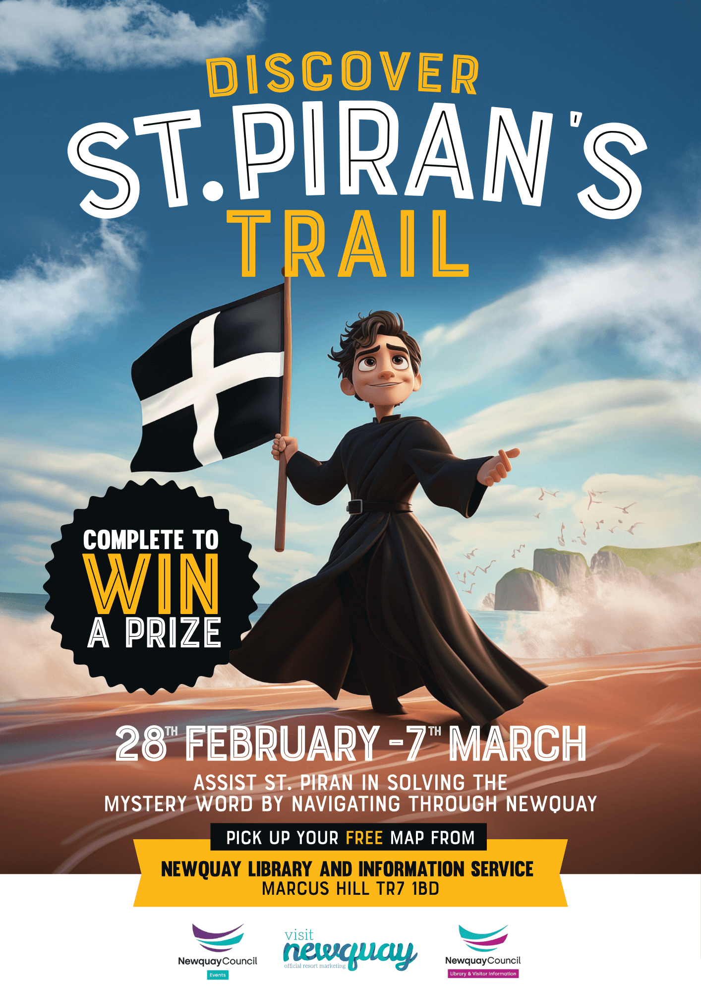 The St Piran’s Trail is organised by Newquay Town Council Events in collaboration with Newquay Library and Information Service. Participants are invited to pick up a free trail map and follow it around Newquay, stopping at key locations to find posters displaying hidden letters.