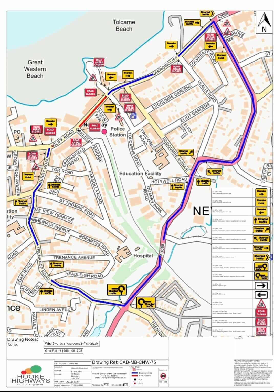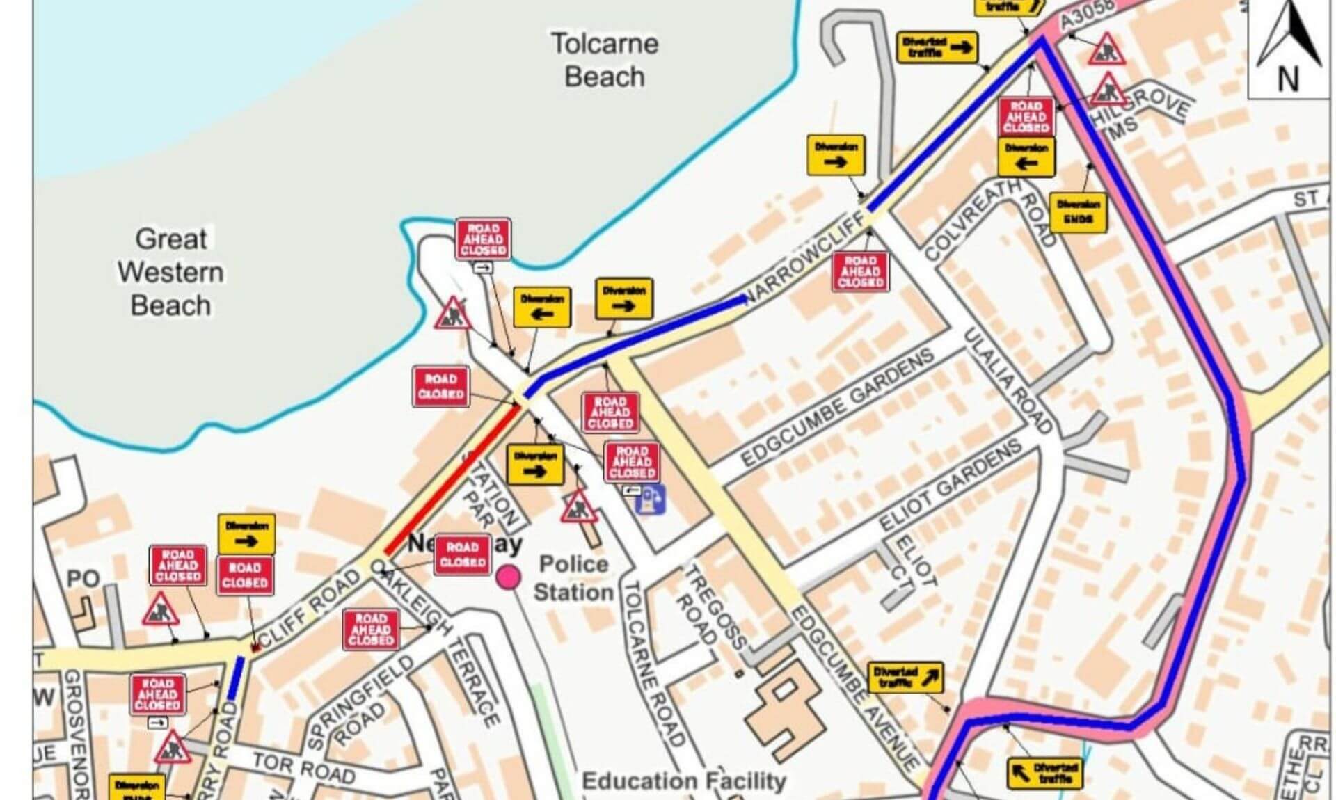 Newquay’s Cliff Road will be closed for planned works from Monday 9th December to Wednesday 11th December, following an emergency repair carried out earlier this year during the busy Boardmasters weekend. The road, which was temporarily patched in August, will now undergo a larger, long-term repair to address the collapsed drain that caused disruption during the summer.