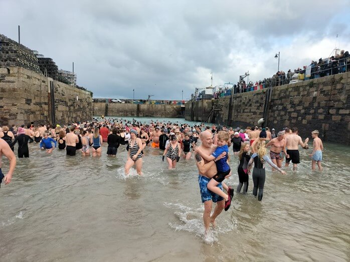 Hundreds of people headed into the sea at Newquay Harbour on New Year’s Day as the annual DIP for CLIC returned for its twelfth year.