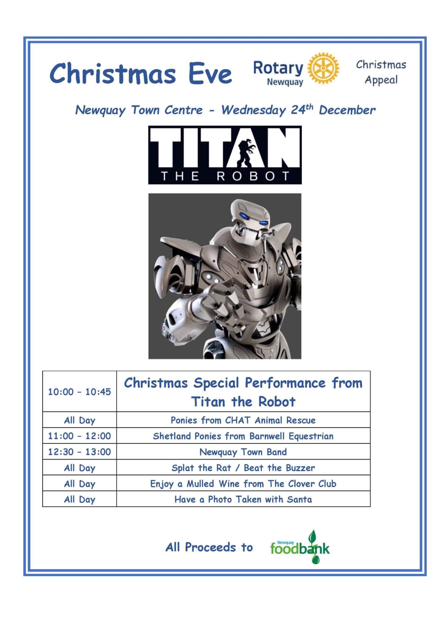 The Rotary Club of Newquay sends its best wishes for a Happy Christmas and a prosperous New Year and invites families to join them on Christmas Eve for a day of festive fun.