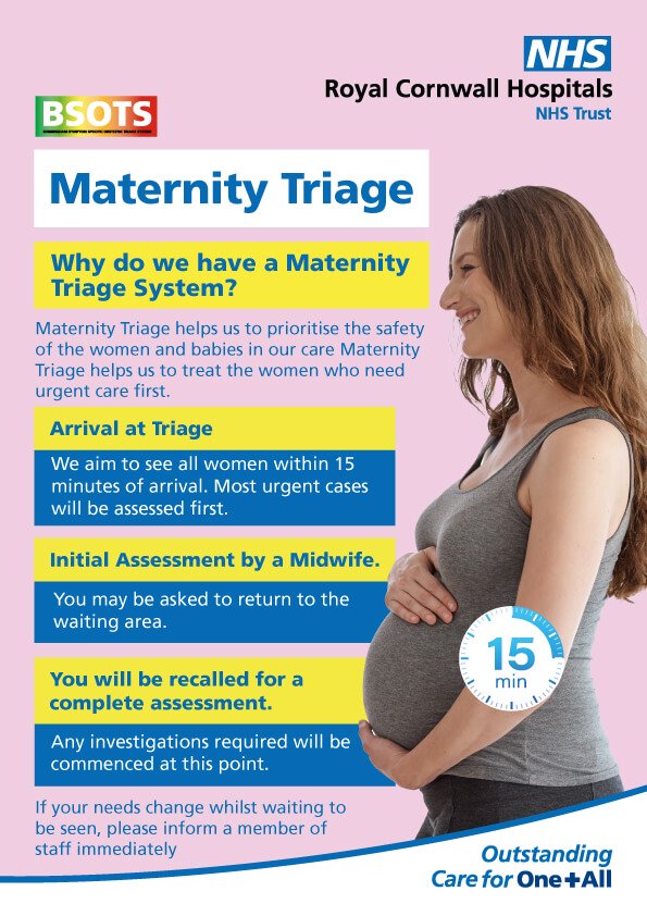 The newly adopted BSOTS (Birmingham Symptom-specific Obstetric Triage System) triage system comes highly recommended by national guidelines and good practice guides. Its primary goal is to streamline the initial assessment process, meaning that patients should receive attention within the first 15 minutes of their arrival. Following this assessment, patients may be asked to wait in the designated area as care priorities are determined.
