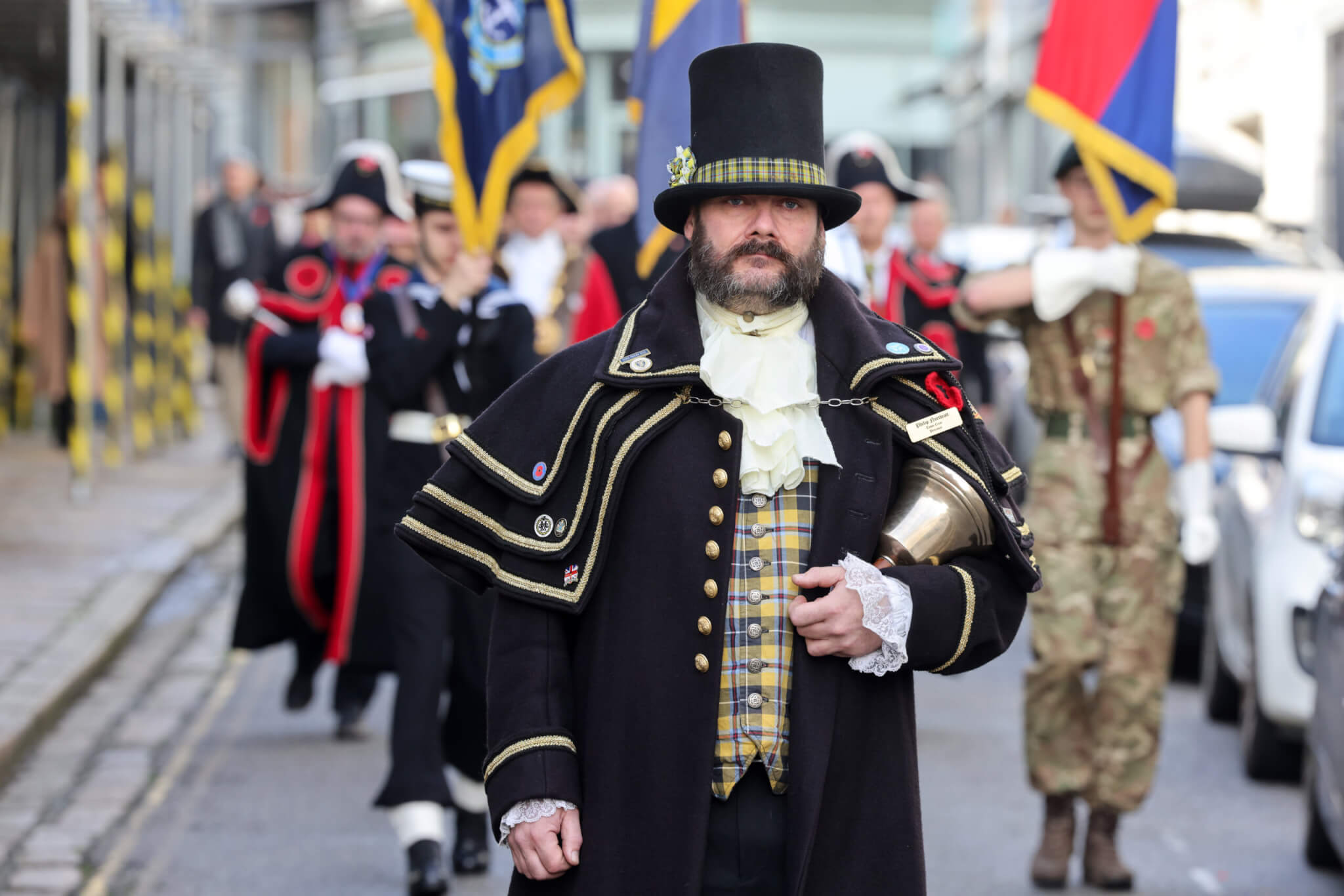 📷Penzance Town Crier Phil Northcott. The people of Penzance come together to honour the fallen on Sunday 10 November at the Remembrance Sunday Parade and Service organised by Penzance Council. Photo by Penzance Council