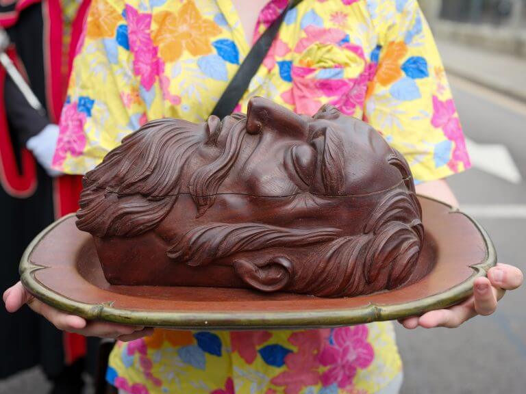 Penzance takes its name from the Cornish “Pennsans”, meaning “Holy Head”, a reference to the headland at Battery Rocks. This history is still visible today through the town’s symbolism, including the image of St John the Baptist’s head on a plate. The symbol appears on the Mayoral Chain, the Town Seal, the historic Market House and several key buildings across the town.