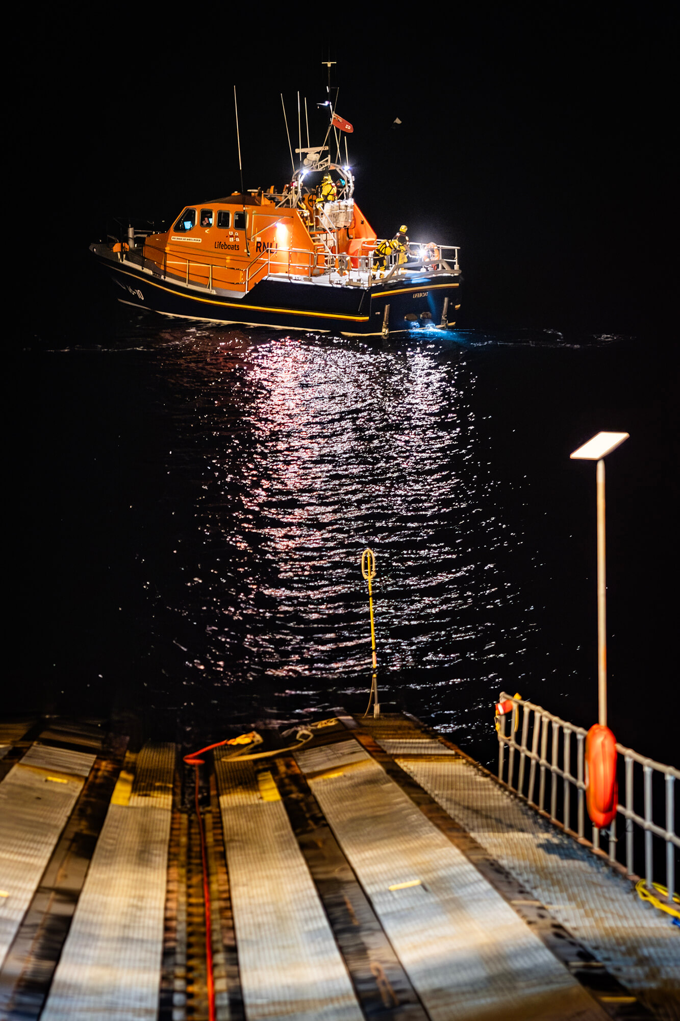 The volunteer crew at The Lizard were sent out at 10pm on Christmas Eve 2024 to deal with a medical emergency on a 100 metre commercial coaster. A crew member on board had sustained serious injuries after falling down a flight of stairs.