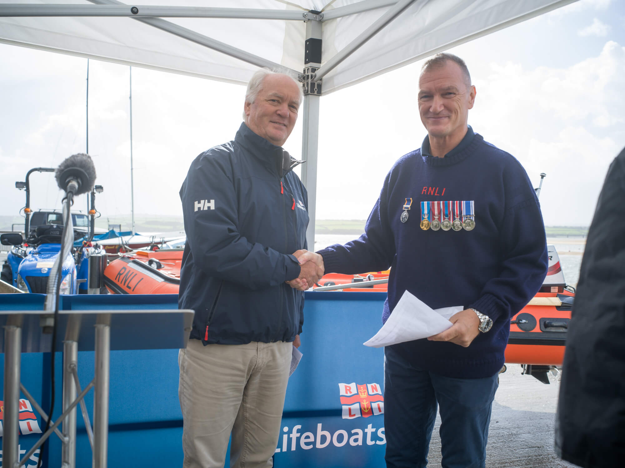 Peter formally handed the new lifeboat into the care of the RNLI, which was accepted by Mark Dowie, RNLI Vice President. Mark then handed the lifeboat into the care of Rock Lifeboat Station, where it was accepted by Pete Thomas on behalf of the crew.