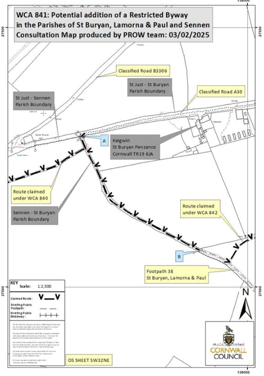 Cornwall Council is reviewing an application to modify the Definitive Map and Statement of Public Rights of Way under Section 53 of the Wildlife and Countryside Act 1981. The proposed change would see the addition of a restricted byway from the A30 to Footpath 38 at Trevorian Common, spanning the parishes of St Buryan, Lamorna & Paul, and Sennen.
