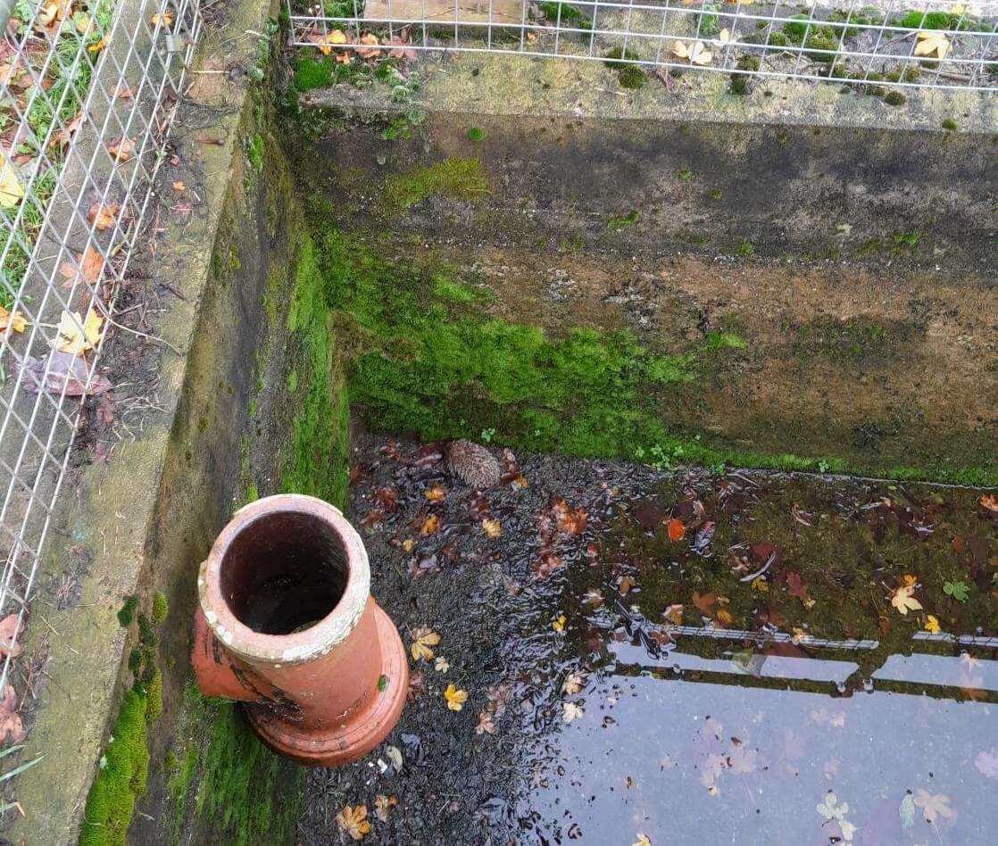 “I was walking the site as part of routine checks when I spotted a small ball of spikes down in the tank. Thankfully the storm tank was empty despite the recent rain. We improvised with a telescopic sampling pole, a bucket and a hoe to scoop him to safety.