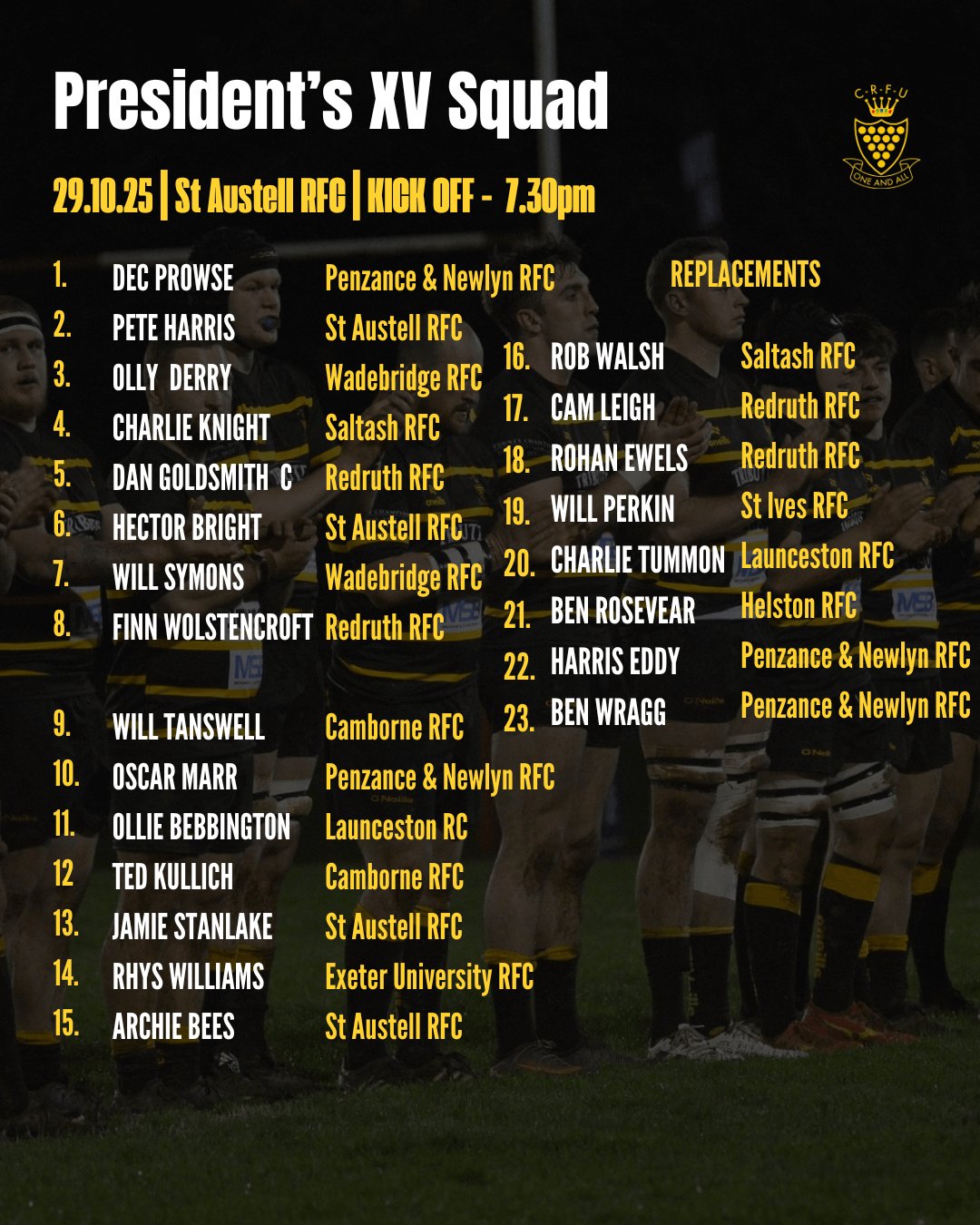 The Cornwall President’s XV v Royal Navy U23s takes place Wednesday 29th October 2025 at St Austell RFC, kick-off 7.30pm. Gates open 6pm.
