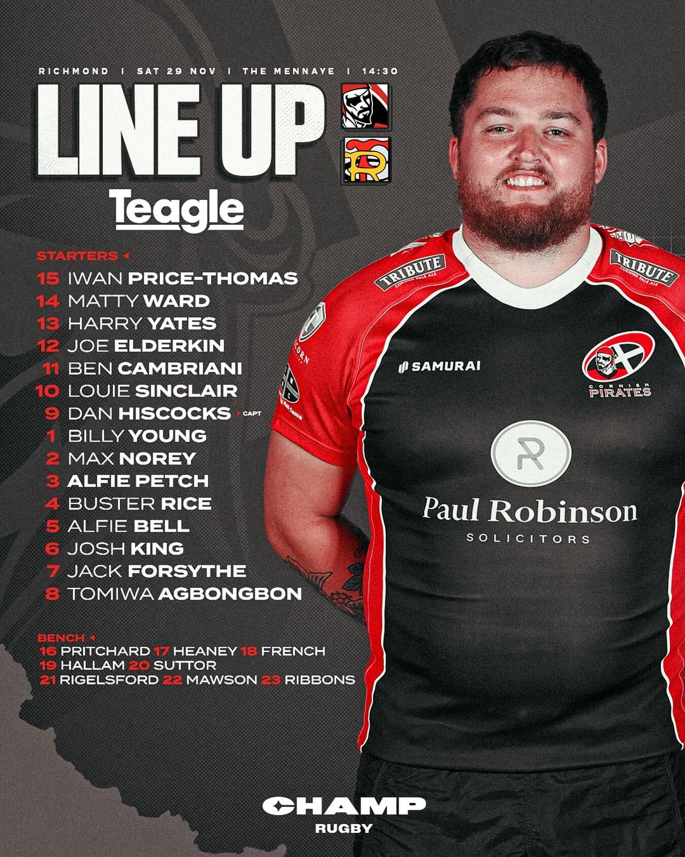 Wing Arthur Relton, prop Alfie Petch and flanker Jack Forsythe return. Max Norey, on loan from Exeter Chiefs and already familiar to Pirates supporters after 19 previous appearances, starts at hooker.
