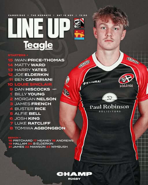 Harry Yates comes in for Chester Ribbons in the centre, while Ben Cambriani takes the wing spot from Arthur Relton. Fly half Louie Sinclair makes his first start for the Pirates after Arwel Robson picked up an injury last week.