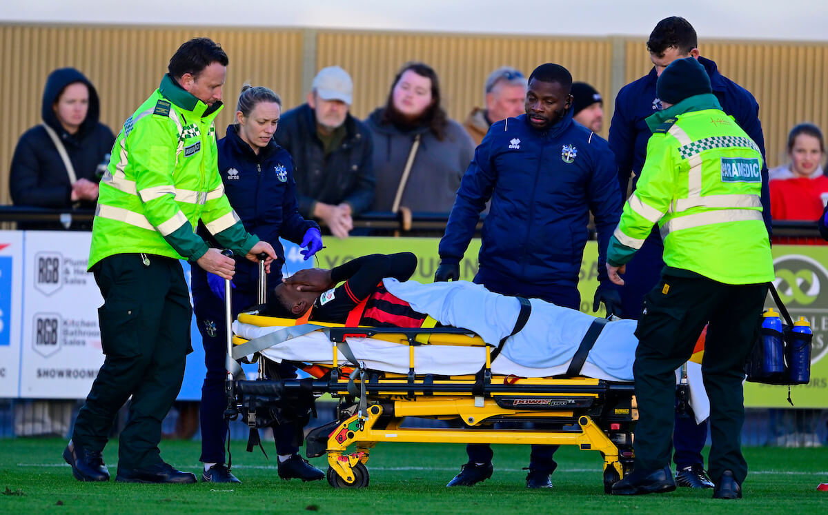 The former Whitehawk flyer was injured in the build-up to Jayden Harris’ opener and Kai Jennings doubled Sutton’s tally just after the restart.