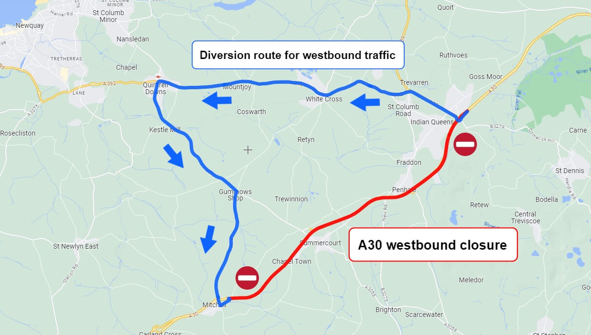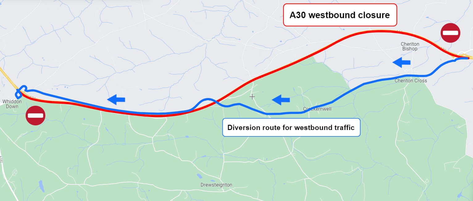 - Diversion: Motorists will be directed via an alternative route, which will be clearly signed to assist in travel around the closed segment of the A30.